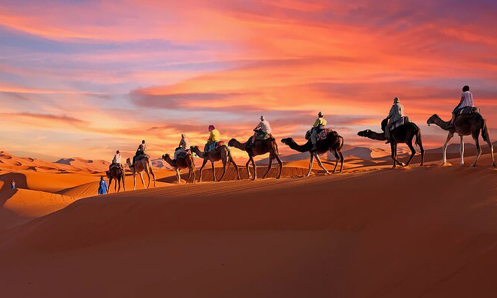 We will meet you after breakfast to start our 4x4 drive experience to explore more of the Sahara Desert and stop in different places for a chance to take some breathtaking pictures, enjoy the local experience of local music (gnawa music), visit nomads and have a glass of tea with them and get close to border between Morocco and Algeria. We will then have lunch in a local restaurant before we get back to hotel for a rest. In the evening, we are going to meet you again to start our camel ride to dunes for a spectacular view of sunset. (dinner and overnight at hotel).